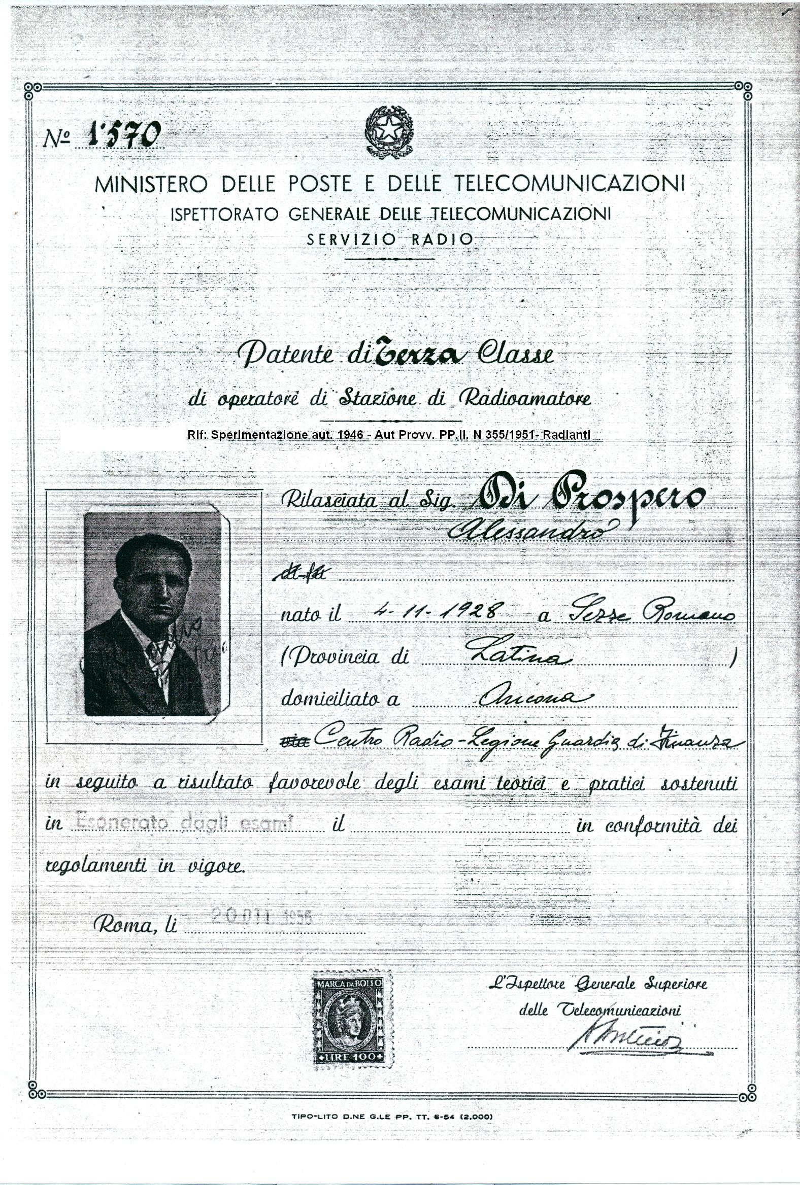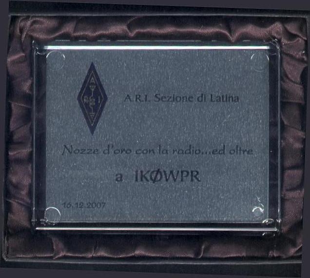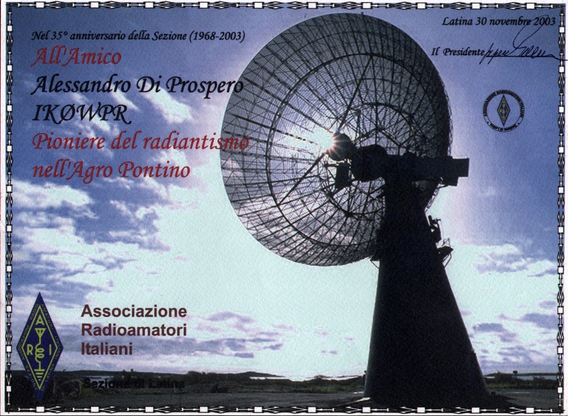 La Sezione A.R.I. di LATINA, rappresentante legittima dell'Associazione Radioamatori Italiani - Eretta in Ente Morale con D. P. R. 368 del 1950 - in occasione del 35° Anniversario della stessa Sezione (1968 - 2003) ha concesso il seguente attestato: